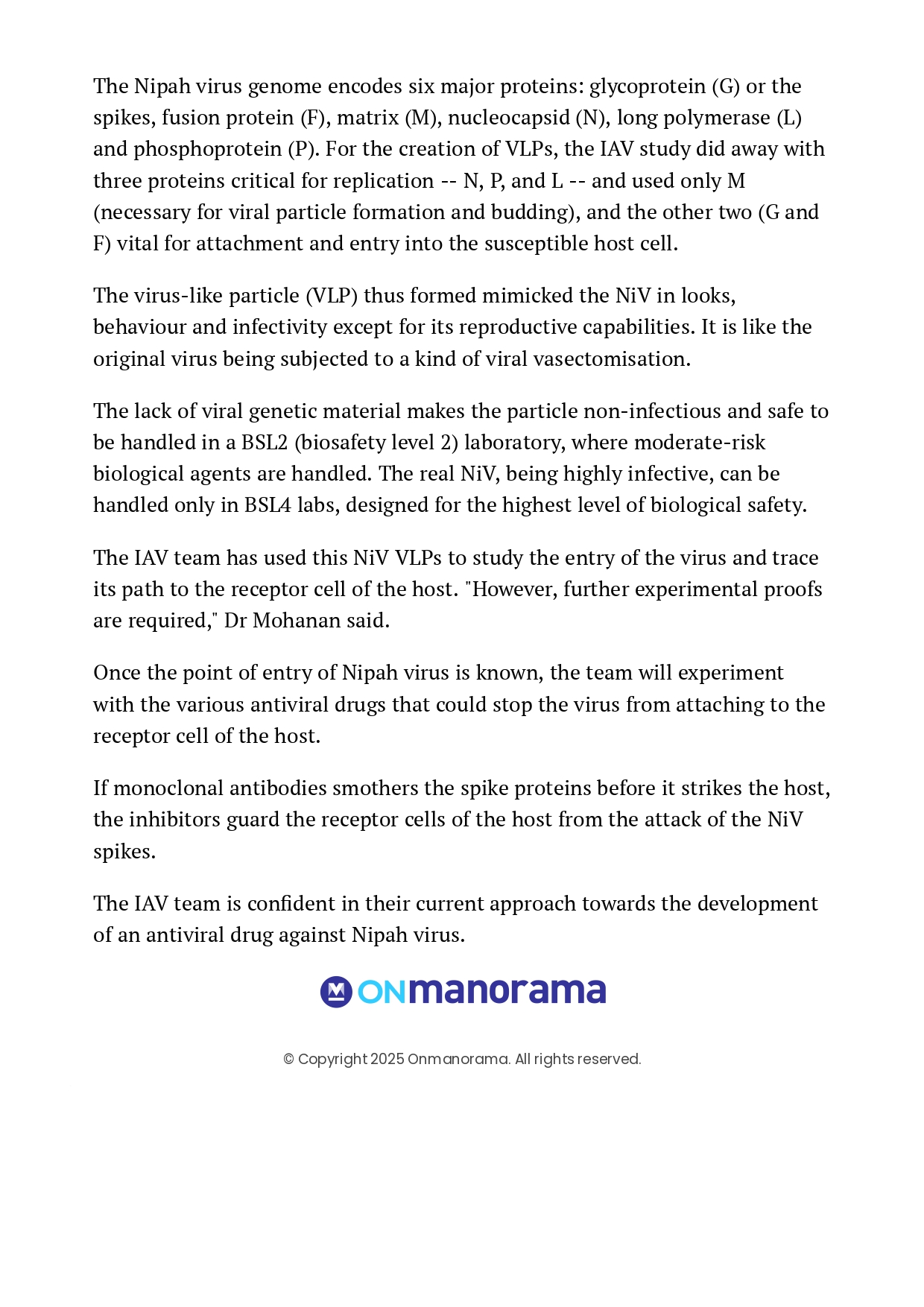 Dr. Mohanan explains that Nipah, like coronavirus, uses spike proteins (glycoproteins or G-proteins) to attach to and infect host cells. The IAV team is developing monoclonal antibodies designed to bind to these G-proteins, thereby blocking viral attachment and subsequent infection. Early administration of these antibodies could significantly reduce the viral load in patients, which is critical given Nipah's high fatality rate.