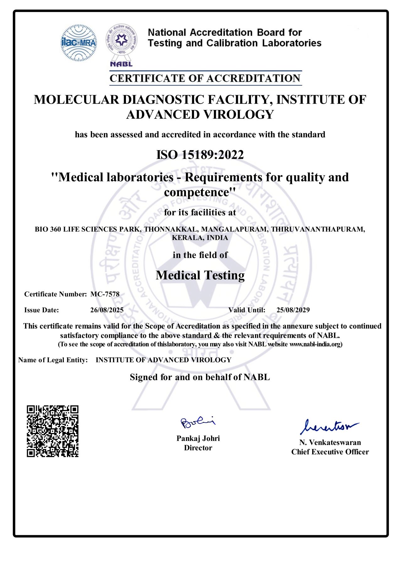 The Molecular Diagnostic Facility of Institute of Advanced Virology is certified with ISO 15189:2022 (NABL) as a testimony of its competence, impartiality and consistent operation in performing accurate and timely diagnosis. The facility conducts diagnosis of more than 83 viral and other infectious diseases.